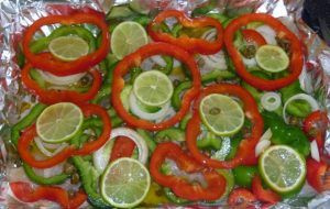 Sobre a folha de papel-alumínio com o lado brilhante para cima, coloque as rodelas de pimentão, cebola e azeite.