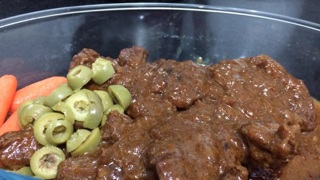 Obs.: Normalmente a capa de filé é uma "manta" comprida, pode cortá-la em 2 ou 3 partes para facilitar refogá-la e usar a panela de pressão de 4,5 litros. Para acompanha: uma salada e arroz branco.