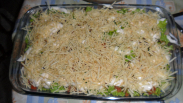 Coloque a batata palha sobre a maionese (somente na hora de pôr à mesa, para a batata não murchar).