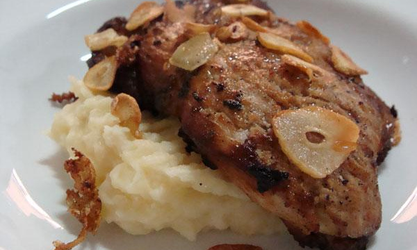 Monte o prato com purê de mandioca, bife de pernil, regado com o alho e azeite.