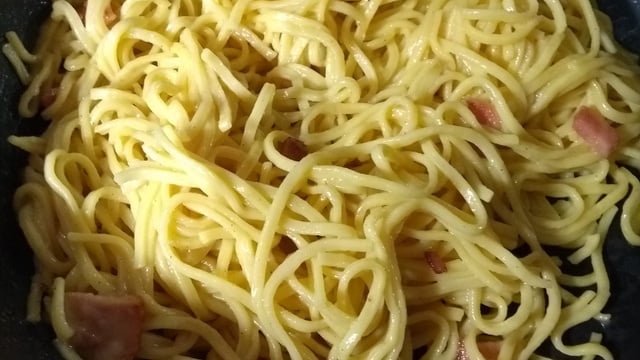 Misturar rapidamente e energicamente afim de que todos os espaguetes fiquem cobertos do molho dos ovos e do queijo.