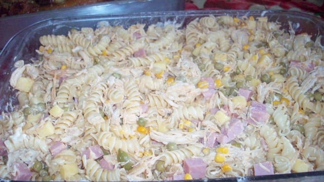 Misture o macarrão com o frango desfiado, o milho e a ervilha.