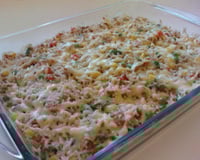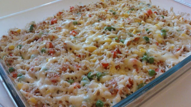 Depois de refogado acrescente o arroz, misture, coloque em um refratário, salpique parmesão e cubra com o queijo ralado.