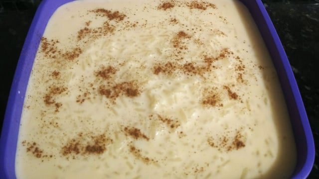 Dissolva o leite em pó na metade do copo de água e despeje sobre o arroz.