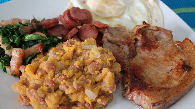 Faça o mesmo com o restante das bistecas, do virado, da linguiça, do torresmo, do arroz e do ovo.