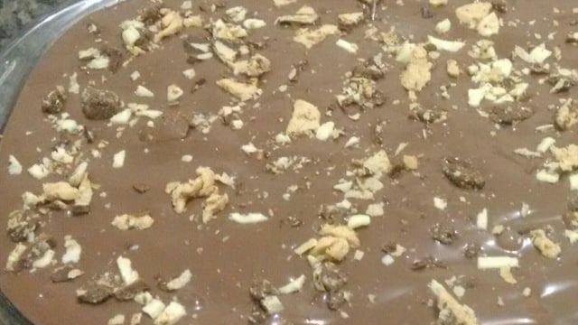 Depois o creme, e por cima um pouco de chocolate picado, e novamente bolacha, creme e chocolate picado, e assim sucessivamente até que chegue a borda da travessa ou acabe o creme, sendo que a ultima camada vai ser de creme.