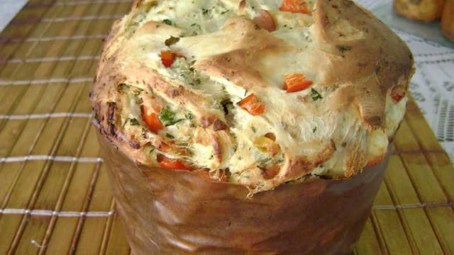 Após crescer, misture com a massa os ingredientes do recheio e sove novamente, faça uma bola, coloque na forma para panetone de 500 g e deixe crescer mais um pouco, por exemplo, em cima do forno aquecido.