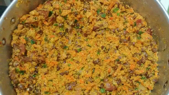 Coloque o feijão, misture bem e acrescente a farinha de mandioca até dar o ponto de farofa desejado, sirva em seguida, acompanhado de arroz branco e bisteca suína frita.