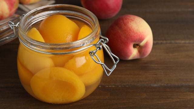 Nesse período, mexa de vez em quanto (com colher de pau de preferência) nesse perído até o pêssego ficar amarelinho e o caldo bem denso. Após, leve à geladeira (como aqueles em lata).