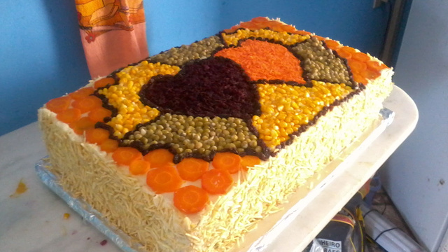 Sugestão de decoração: batata palha, ervilha e flor de tomate com folhas de pimentão.