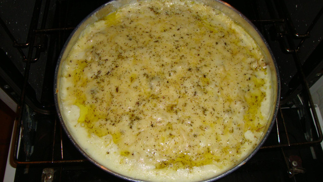 Em um refrátario redondo médio (26 cm de diâmetro), coloque o purê de batatas, o refogado de frango, o restante do requeijão e cubra com batata palha.