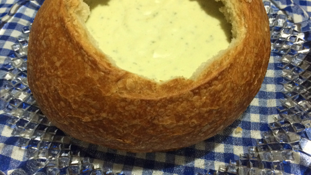 Para comer, retire a tampa do pão italiano e mergulhe os miolos no interior, com cuidado para não se queimar.