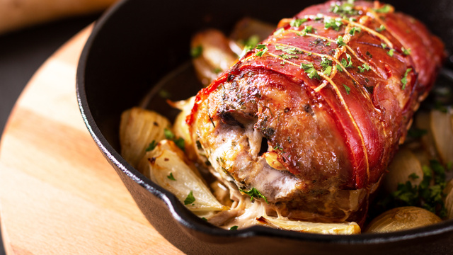 Depois de temperado prenda o bacon por cima do lombo com palitos de dente se necessário.