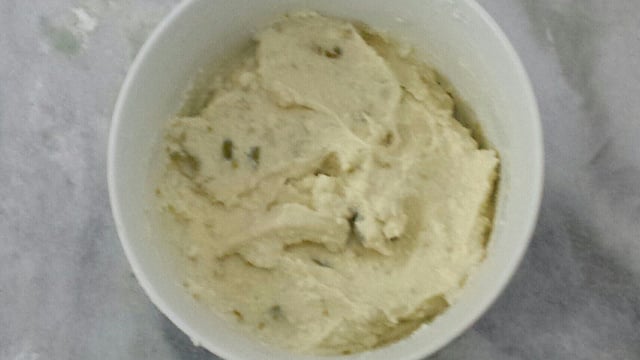 Quando a ricota já estiver toda triturada, coloque o creme de leite e misture com uma colher e adicione em seguida o sal.