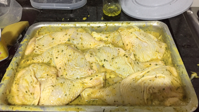 Em uma tigela coloque a sobrecoxas e acrescente suco do limão, vinagre, sal, pimenta e o manjericão.