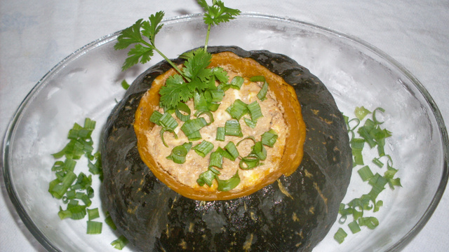 Retire e reserve. Remova a polpa da abóbora com uma colher e descarte. Recheie com a carne refogada.
