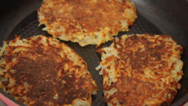 Descasque as batatas e rale-as. Junte a batata ralada á mistura da tigela. Separe uma frigideira e Unte com manteiga. Prepare a mistura fritando-a como panquecas.
