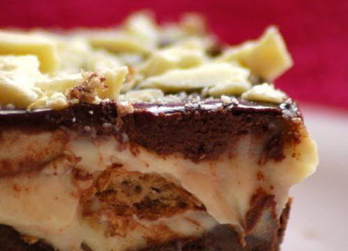 Com a faca, quebre o chocolate branco grosseiramente e coloque por cima. Leve à geladeira e sirva no dia seguinte. Para servir, separe com uma faca e retire com espátula de bolo. Fica bonito no prato. Rende uma travessa de vidro retangular de tamanho aproximado 30x18x5 cm.