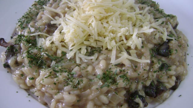 Com uma concha, coloque um pouco do caldo e mexa. Faça isso até que o arroz esteja cozido, mas al dente, e cremoso, sempre colocando o caldo aos poucos e mexendo até o arroz absorver.