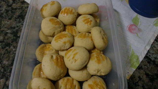 Unte uma forma com margarina e nela acrescente bolinhas pequenas feitas com a massa. Em seguida, com um garfo, pressione levemente a bolinha. Por fim, pincele com a gema.