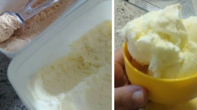 Depois dividir a mistura em 2 partes iguais, bater cada parte da mistura separadamente por 10 minutos em batedeira ou até que dobre o volume, com 1 colher de emulsificante e 2 colheres de sabor.