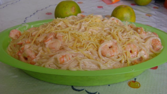 Doure o alho no azeite aquecido, junte os camarões, o sal, quando estiverem cozidos acrescente o requeijão e deixe derreter.