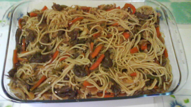 Coloque o molho de carne e legumes sobre o macarrão e misture um pouco, para o molho penetrar no macarrão e sirva a seguir!