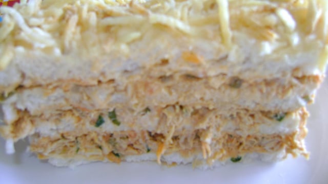 Em um refratário, forma ou até mesmo em potes específicos para torta fria, coloque uma camada de pão e outra de salpicão e assim sucessivamente, acabe a camada com o pão, va apertando pra acomodar bem o salpicão no pão.