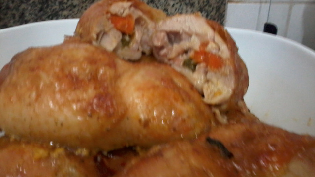 Com uma faca fina abra a sobrecoxa e faça um corte interno na coxa e na ponta corte em volta do osso, deixe a pele. Dessa forma a coxa ficara oca.