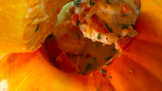 Coloque tudo na moranga, retire um pouco da polpa da moranga e misture ao creme de camarões e volte ao micro-ondas por mais 10 minutos.