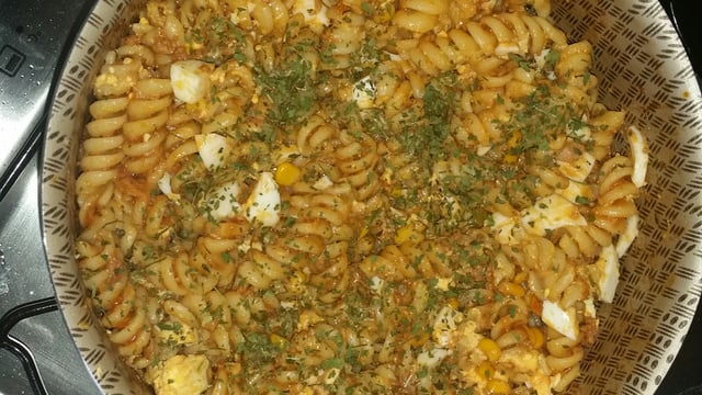 Desligue o fogo e coloque o cheiro verde e misture bem com o macarrão.