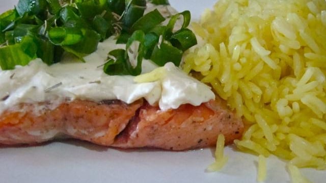 Em uma frigideira funda derreta a manteiga e um fio de azeite para não ficar enjoativo. Doure primeiro a cebola e depois o alho em lascas. Coloque o filé de salmão com pele mesmo e vá regando. Tampe a frigideira por uns 3 minutos. Após esse tempo vc verá que ele já está semi-pronto. Fica dourado por fora e meio cru por dentro. Se não gostar assim, deixe mais tempo, para cozinhar mais.