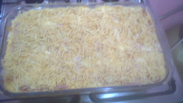 Acrescente o requeijão cremoso, presunto, queijo e para finalizar a batata palha.