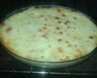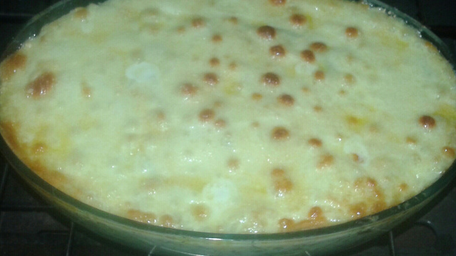 Em um refratário alternar camadas de molho branco, bacalhau e purê, por último cobrir com a mussarela.