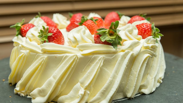 Regue uma metade do bolo com a calda que formou do purê, coloque o recheio e morangos picados e coloque a outra metade do bolo por cima.