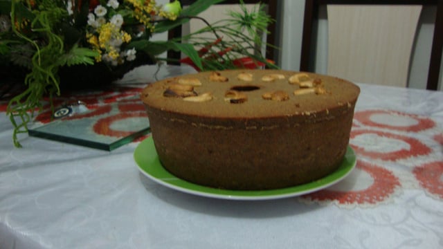 Demora cerca de 2 horas, dependendo do forno. Quando fizer uma hora de forno, enfeite com as castanhas inteiras e leve novamente para assar, fica pronto, quando ao enfiar um palito ele saia limpo. Deve ficar douradinho em cima.