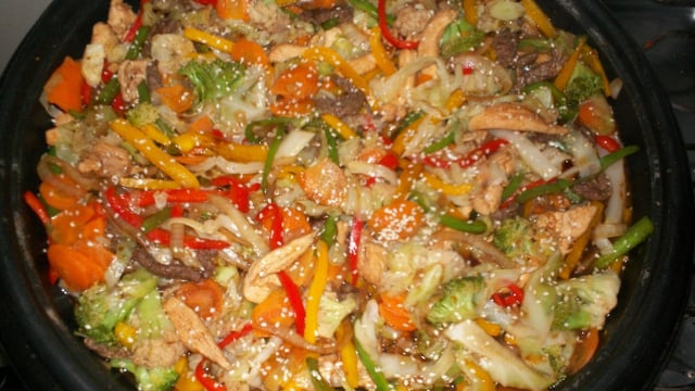 Cortar as carnes, pimentões e a cebola em tiras. Fritar as carnes com um pouco de óleo de gergelim, acrescentar a cebola os pimentões, os legumes pre cozidos e o macarrão, misturar ate encorporar tudo, colocar o molho para yakisoba e o shoyu.