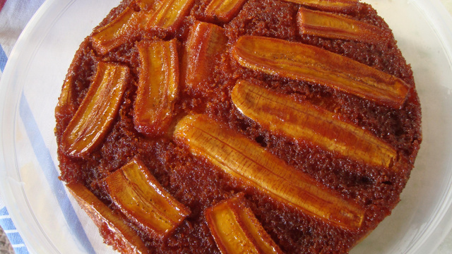 Leve o açúcar ao fogo, quando derreter por inteiro acrescente a água e deixe ferver para a calda engrossar, espalhe na forma redonda de 26 cm sem untar incluisive nas laterais, em seguida coloque as bananas cortadas em fatias.