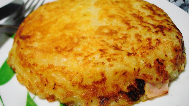 Cubra com batata ralada a omeleteira e acrescente seu recheio. Coloque a outra parte da omeleteira por cima com o resto da batata ralada e leve ao fogo, virando de vez em quando, em fogo médio, por aproximadamente 15 minutos, ou até dourar por fora, e está pronto.