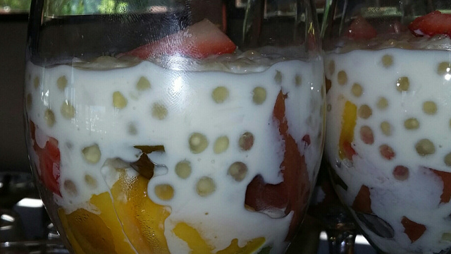 cozinhe o sagu com a água conforme instruções da embalagem, espere esfriar e acrescente os outros ingredientes, se quiser mais doce acrescente açúcar, misture bem e sirva gelado.