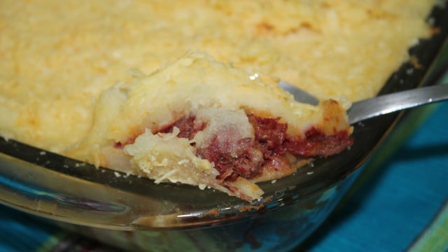 Forre o fundo de uma refratária com a carne, por cima espalhe o catupiry, cubra tudo com o purê de batatas e salpique o queijo parmesão por cima, leve ao forno para gratinar e sirva com arroz branco e salada.