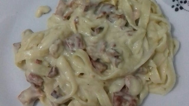 Depois acrescente o bacon e a calabresa já fritos, misture bem e abaixe o fogo.