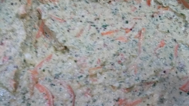 Em uma bacia, desmanche a ricota com um garfo e acrescente todos os ingredientes e misture bem.