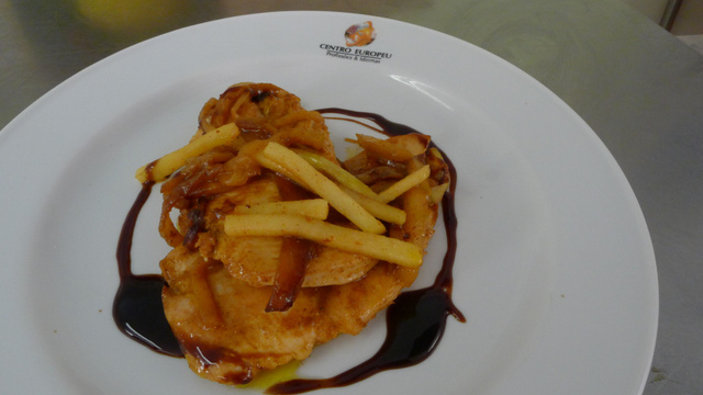 Quando dourar de um lado, vire, coloque a água e acescente a maçã descascada e cortada em palitos.