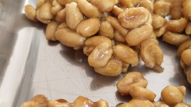 Assim que desligar coloque rapidamente o amendoim no açúcar e depois de mexer um pouco coloque no tabuleiro untado.