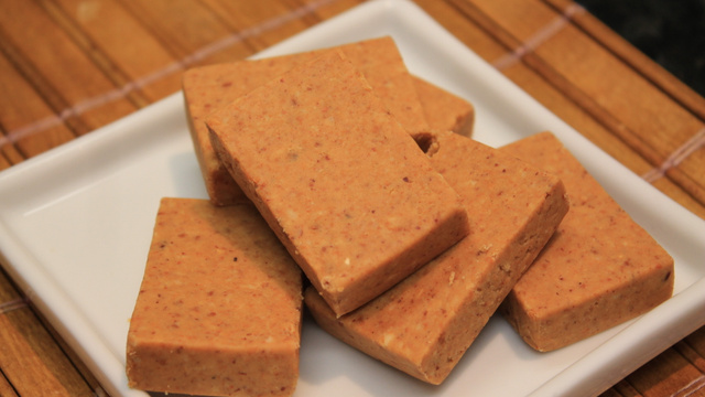 Depois coloque em um refratário e espalhe a massa com as mãos até cobri-lo todo, depois corte em cubos.