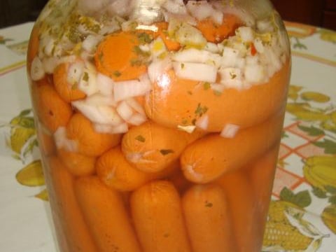 Coloque as salsichas em um vidro com tampa rosqueável, acrescente, a cebola, o alho, as ervas, o sal, a pimenta. Despeje a água quente fervida com folhas de louro sobre as salsichas até a metade do vidro, complete com vinagre. Deixe esfriar e guarde em geladeira. Sirva após uma semana como aperitivo.