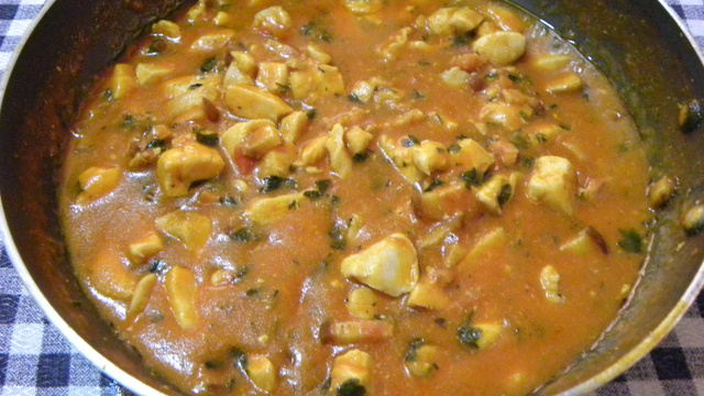 Adicione o molho de tomate e deixe ferver por aproximadamente 2 minutos, adicione o leite de coco, mexa e deixe ferver por mais 2 minutos, adicione a salsinha picadinha e mais um minuto de fervura. Prove para ver se precisa de mais sal, está pronto para ser servido.