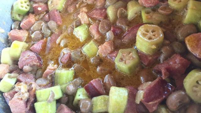 Em uma panela separada junte o azeite, a linguiça, o bacon, a cebola e o alho deixe dourar, após coloque o quiabo a caldo de carne e o cheiro verde com pouca água, deixe dar uma leve cozinhada.