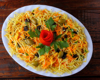 Na hora de servir, desenforme o salpicão num prato redondo. Corte o melão em fatias e coloque as fatias ao redor do salpicão de modo que forme um estrela com as pontas.Entre as fatias de melão coloque as fatias de presunto enroladas nos fios de ovos. Jogue um pacotinho de batatinha palha por cima. Leve a mesa.